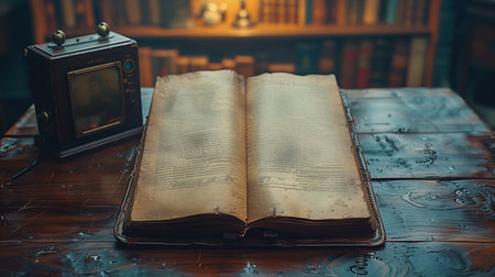 An old, leather-bound book open on an antique desk, with a quill pen and ink bottle adding to the vintage feel.