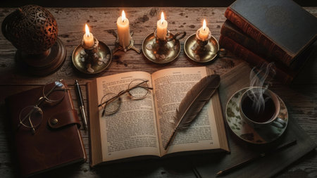 An open book rests on a wooden desk, illuminated by the warm glow of lit candles. Beside it are eyeglasses, a pen, and a feather. The scene presents a cozy, intimate atmosphere with soft lighting and a focus on detail. This image is suitable for illustrations about writing, education, and vintage themes.