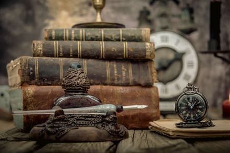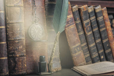 Compilation of old books on wooden desk and writing pen.