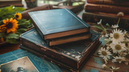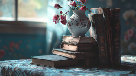 A stack of vintage books and a porcelain teapot with flowers, placed by a sunlit window for a warm, nostalgic setting.