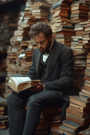 A man with a beard sits on a wooden crate, deeply focused on a book open in his hands. Surrounded by towering stacks of vintage books, the warm, atmospheric light creates an inviting ambiance for reading.