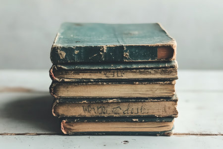 Five worn and weathered books are stacked on a rustic wooden surface. Their spines exhibit signs of time, with hints of faded titles. Dust and sunlight add a nostalgic charm, inviting readers to rediscover forgotten tales.