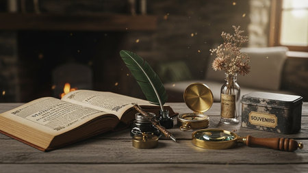 A still life composition on a rustic wooden table an open antique book with handwritten text, a quill pen resting in a brass inkwell, a vintage compass, a magnifying glass, and a tin labeled Souvenirs. In the background, a fireplace glows with warm light, casting a cozy and historical atmosphere. Dust particles dance in the light, adding to the vintage aesthetic.