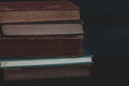 Literature, reading concept: banner or header image with stack of antique books against a dark background