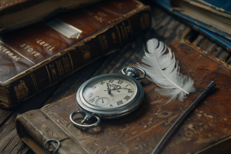 An antique pocket watch rests beside a delicate feather quill on a stack of worn leather-bound books. The rustic wooden table adds warmth to this nostalgic arrangement, evoking a sense of history.