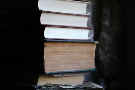 book background. Stack of books in the library. Old yellow pages of paper books. learning and knowledge.