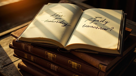 A captivating stack of vintage books, illuminated by warm sunlight, features a handwritten question: Are you ready for tomorrow? The image showcases the textures of antique leather and aged paper, evoking a sense of history and wisdom. This inspirational scene, with its play of light and shadow on a wooden table, offers a powerful visual for themes of education, learning, future planning, and personal motivation. Ideal for websites, blogs, or marketing materials promoting knowledge and self-improvement.