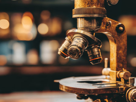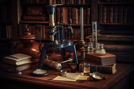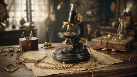 This captivating image features an antique microscope elegantly placed on a vintage wooden table. Surrounding it are exquisite objects and old documents, creating a charming atmosphere.