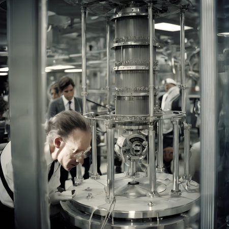 A scientist in a white coat and protective glasses is closely examining a complex piece of machinery in a high-tech laboratory. The equipment appears to be an advanced scientific instrument, possibly related to quantum computing or particle physics. The laboratory is filled with stainless steel structures, with other researchers visible in the background, all engaged in their respective tasks.