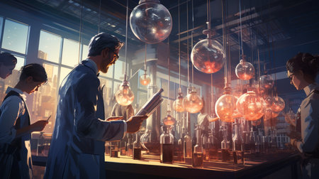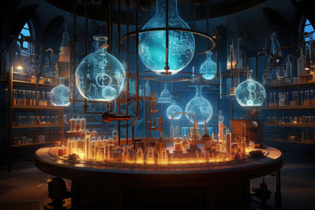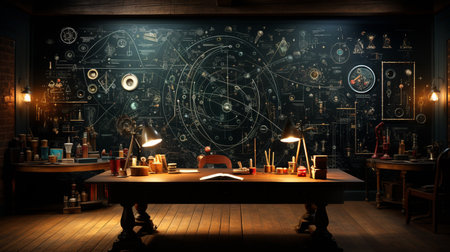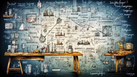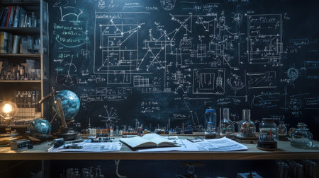 A detailed science laboratory scene showcases a black chalkboard filled with complex formulas and diagrams, surrounded by glassware and tools, inspiring creativity and learning.