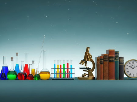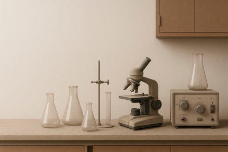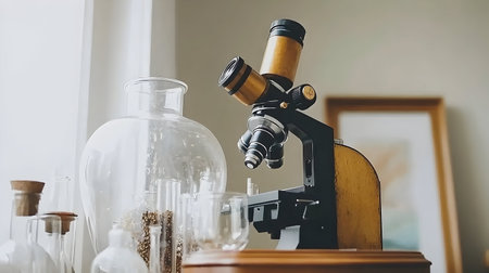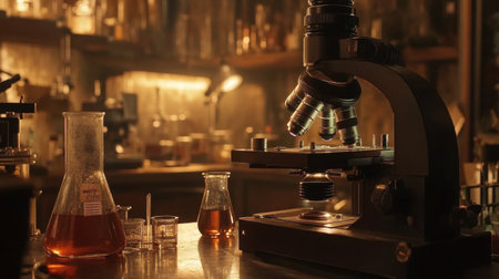 A vintage microscope and lab glassware are on a wooden surface near a window, illuminated by soft natural light. The image conveys scientific research and discovery. Ideal for educational or scientific publications.