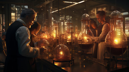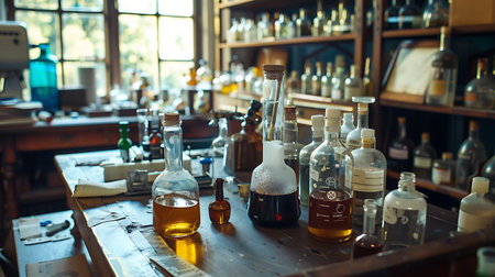 Intricate glassware fills the workspace, revealing a blend of scientific exploration and artistry. A variety of vessels sit on the wooden table, showcasing amber and golden liquids. Sunlight filters through the windows, casting soft shadows and creating an inspiring atmosphere for experimentation and discovery.