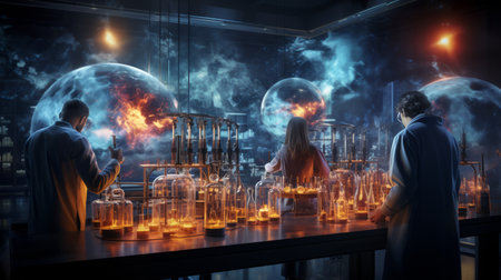 Team of researchers in protective gear working with chemical reactions and smoke in a laboratory