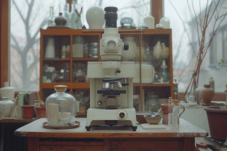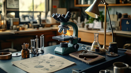 A beautifully arranged laboratory workspace featuring a vintage microscope, various scientific instruments, sketches, and plants, ideal for education and research.