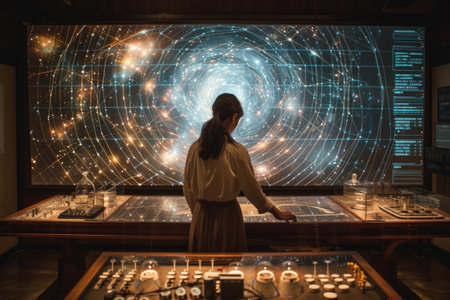 A woman stands before a vast display of the galaxy, hands on an interactive console, surrounded by a cosmos of golden hues and technological details. A.I.