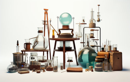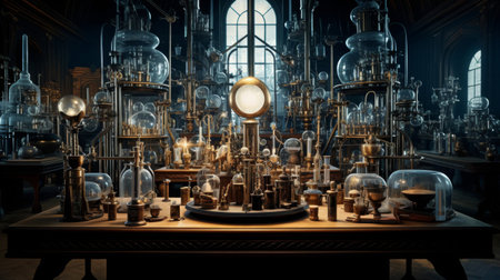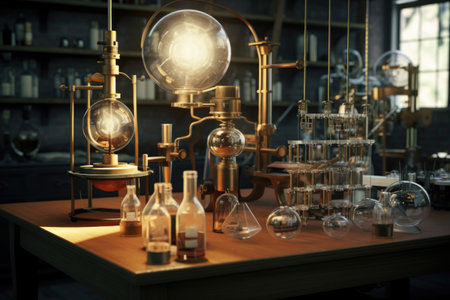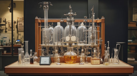 A detailed view of an antique laboratory showcasing various glass containers and tools on a wooden table.