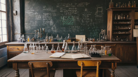 A classic chemistry classroom with a teacher desk full of glassware, chemical bottles, and a blackboard scribbled with formulas, embodying a learning environment