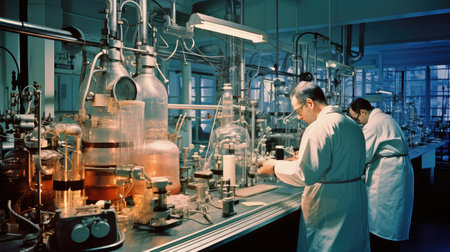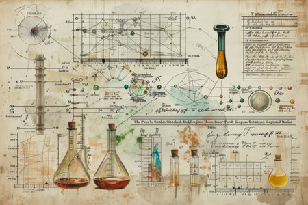 Illustration of a chemistry lab setting with a flask, pipette, and another pipette in use, Diagrams and diagrams outlining the steps of a scientific experiment