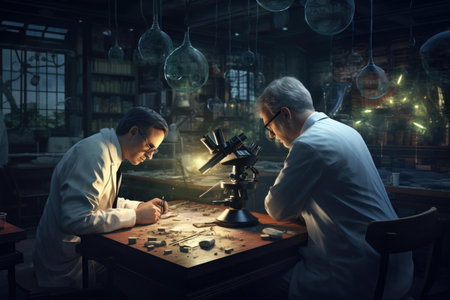 Dedicated Scientists research microscope work. Chemist virus. Generate Ai