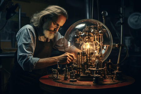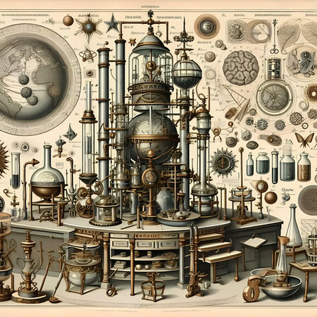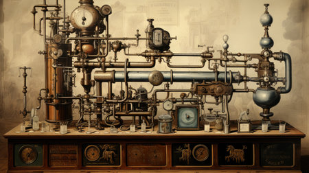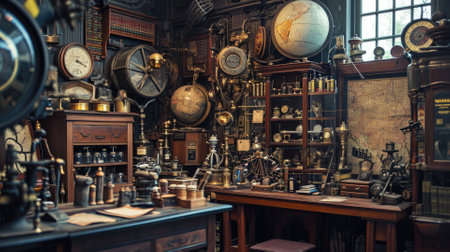 Workshop of Steampunk Inventors with Brass Gears and Instruments