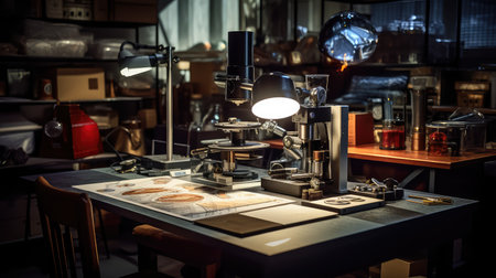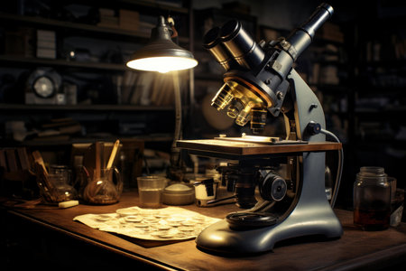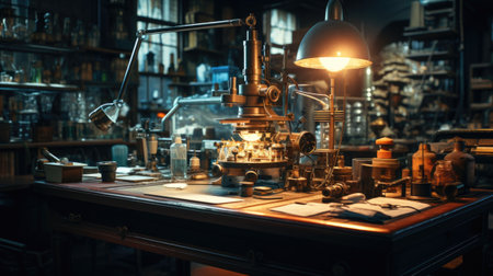 A captivating vintage laboratory setting showcasing an antique microscope, illuminated workspace, and detailed maps, evoking a sense of scientific exploration and historical research.