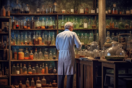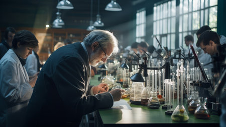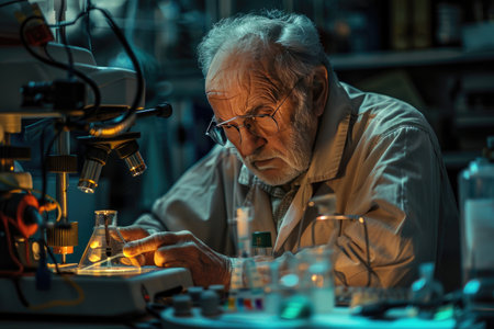 An elderly man is absorbed in working with chemical reagents. Scientific research activities.