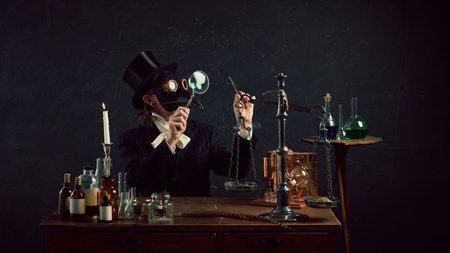 Alchemist-inspired plague doctor immersed in work, balancing old-fashioned scales in vintage laboratory against dark mystery background. Concept of comparisons of eras, medicine, pharmaceutical. Ad