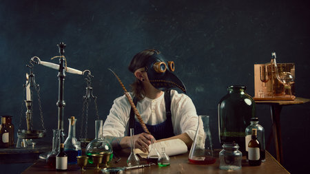Mysterious man in plague doctor mask sits amidst vintage lab equipment, and noting with feather in vintage laboratory against dark mystery background. Concept of medicine, science, pharmaceutical.