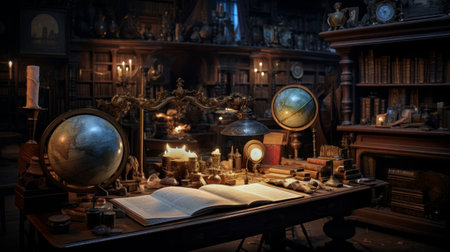 Philosopher's study with ancient scrolls instruments soft candlelight