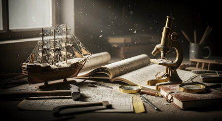 A vintage scholar's or explorer's desk filled with various objects like a model sailing ship, a microscope, maps, books, and magnifying glasses. The dusty, atmospheric lighting suggests a scene of historical discovery, research, and adventure. This evocative still life captures a sense of curiosity and intellectual pursuit.