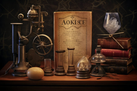 A vintage laboratory features display an antique microscope, glass beakers, and stacked leather-bound books, all set in a dimly lit wooden environment.