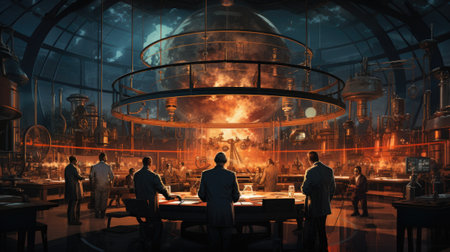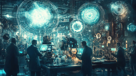 Victorian inventors and futuristic engineers are engaged in a brainstorming session, surrounded by advanced equipment and glowing holographic displays, showcasing their innovative designs and ideas.