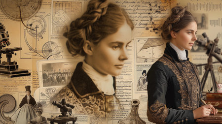 Determined Woman In Vintage dress with Historical Scientific Diagrams and Instruments. Female Contribution To Science. Women History Month. STEM. AI Generated.