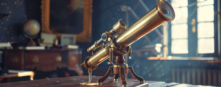Retro lunar observatory, brass telescopes, charting stars, velvet jackets