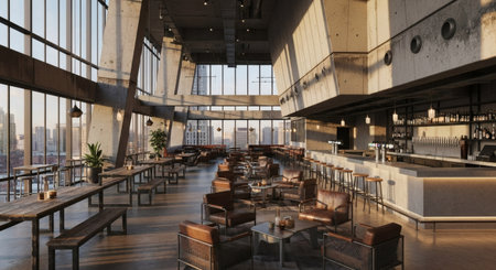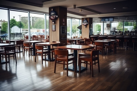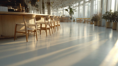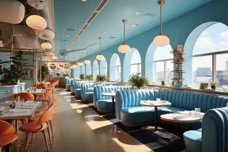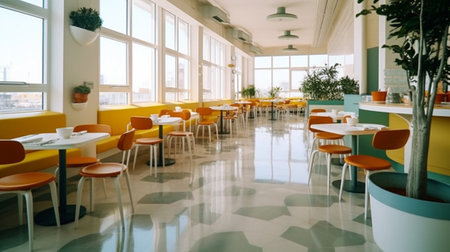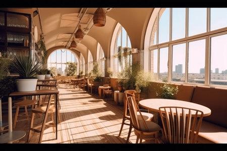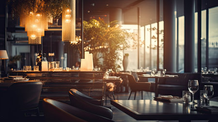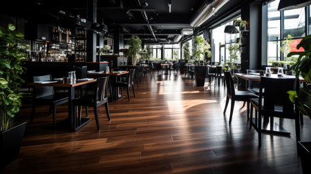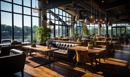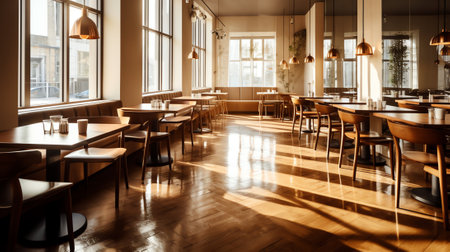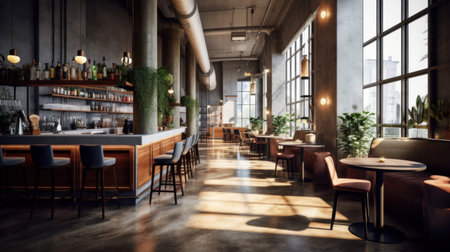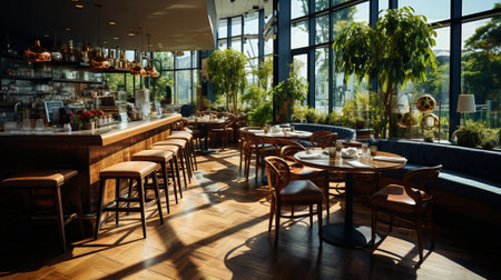 Generative AI Interior of a modern urban restaurant in the morning sunlight