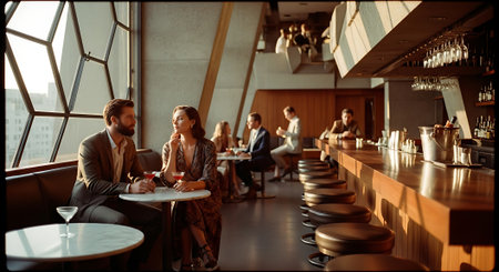Vibrant city atmosphere in modern rooftop bar overlooking sunset skyline. That the image is generated using AI.
