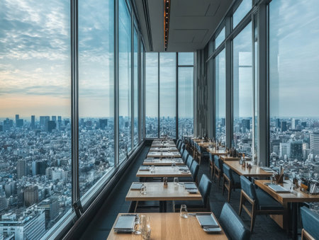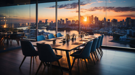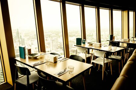Dining table setting inside the restaurant with panoramic view of cityscape through the glass windows