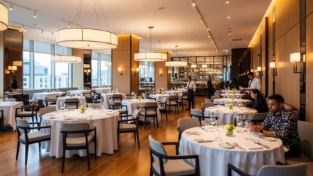 Blurred scene inside a contemporary high end restaurant during the evening. Patrons are dining at tables with city lights visible through large windows, creating an elegant ambiance.