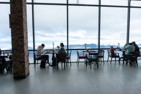 Lao Cai, Vietnam - Jan 3, 2019: Tourists having drinks in restaurant on top of Fansipan, the Roof of Indochina, in Sapa town, northen Vietnam