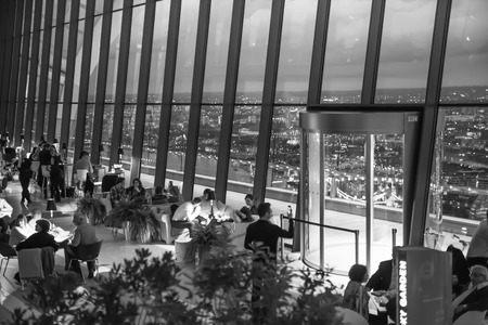 LONDON UK - 22 MAY, 2015: People in the restaurant of Walkie-Talkie skyscraper with beautiful night City of London lights background.