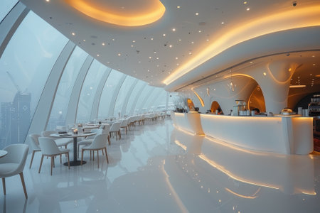 Luxury interior of a restaurant with a beautiful view to the city