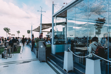 Madrid, Spain - November 3, 2017: People enjoying at cafe on Circulo de Bellas Artes of Madrid rooftop at sunset.