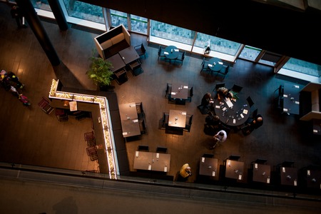 Top view on wooden tables in cafe. Nobody in coffee shop.
