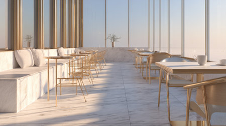A serene and elegant cafe interior showcasing modern furniture, ample sunlight, and minimalist design. Perfect for relaxation and socializing.