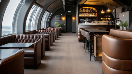 Experience the allure of a modern restaurant interior featuring ambient lighting, sleek furniture, and an inviting atmosphere perfect for dining and socializing.