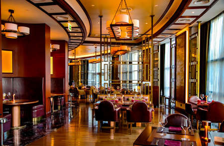 Interior of a restaurant with tables and chairs in a luxury hotel