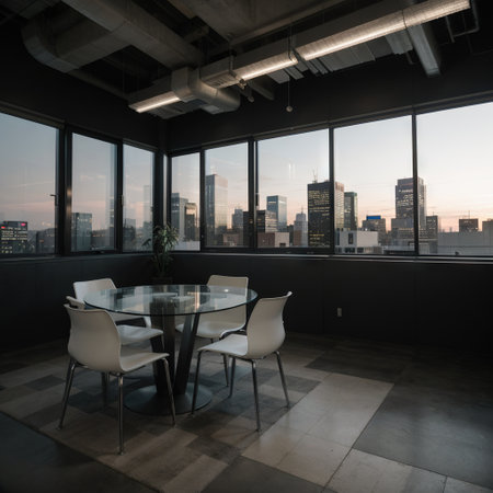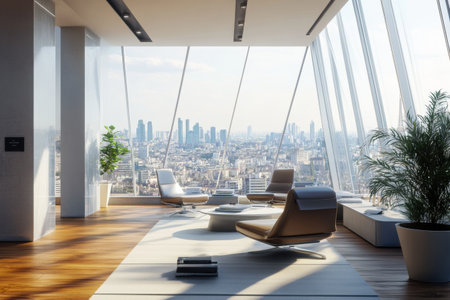 A spacious urban loft featuring large windows that offer a stunning view of the city skyline, complemented by indoor plants, creating a serene and stylish atmosphere.