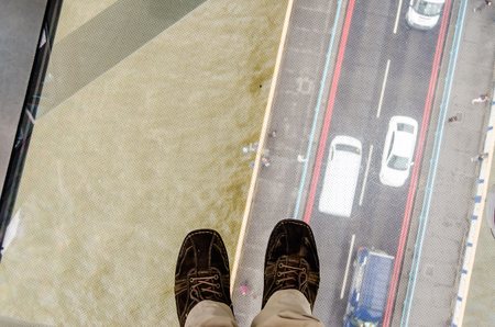 On a glass floor at high altitude in a Dubai Frame building.