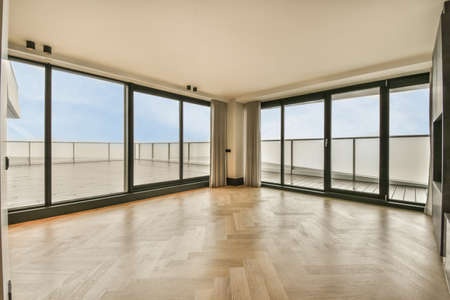 Empty room interiors with large windows providing natural lighting and views in neutral tones
