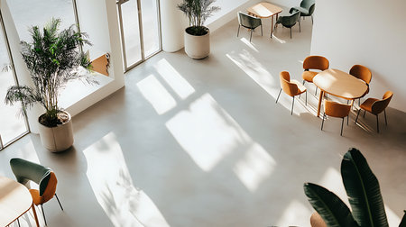 A serene coffee shop interior showcasing minimalist design and natural light.